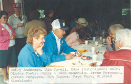 Photograph - Chatsworth Country Club picnic, near Vermilion, AB. A crowd of people standing and sitting at tables, inside a building. Pictured in the photograph are: Emily Anderson, Jim Tovell, Edna (Hutchinson) Bain, Gladys Fooks, Jenny & John Hasenuik, Irene Ferguson, Vernon Ferguson, Ron Tipper, Faye Park & Mildred Klashinsky |