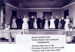 Photograph - A stage full of kindergarten children dressed in suits and dresses as they perform in a Christmas concert, Rockyford, AB. Mother Helen Clare Schmaltz' kindergarten presents their part of the Christmas concert in the Town Hall "Country Life in the Town Hall"