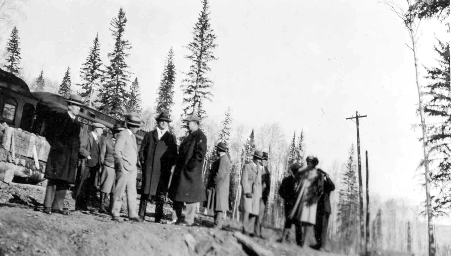 Photograph - A group of people standing in front of a railway car, April 29, 1927. Athabasca, Alberta |