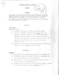 Document - This document contains the by-laws for The Athabasca Live Arts Society, as adopted and accepted on May 3, 1977. Included in the by-laws are the purpose of the group, as well as the membership requirements of the group. Also contained in the document is the way in which officers are elected, each officer's duties, and their terms of office. How and when meetings will be run, as well as quorums, voting, borrowing powers, keeping records and remuneration are also contained in this document (6 pages) |