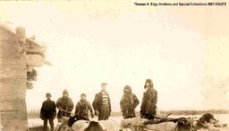 Portrait of six men standing outside beside a building with two dog sleds full of materials, Fort Smith. Note on the back reads: ""Mai leaving Fort Smith for Edmonton, 1910.""